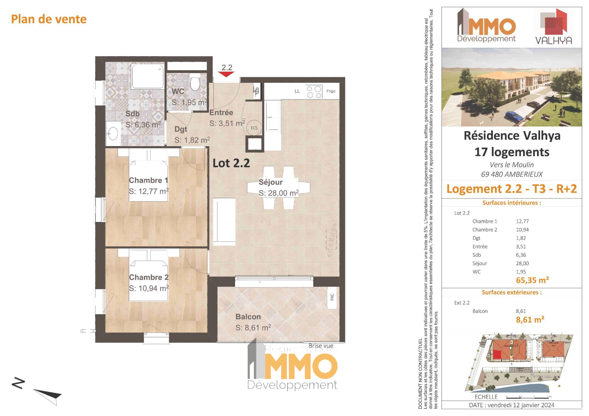 Ambérieux (69480)IMMO-DEVELOPPEMENT vous propose un appartement en exclusivité de type T3 au 2ème étage, d'une superficie de 65m² avec terrasse de 8m². Cet appartement est composé d'une cuisine non équipée ouverte sur le séjour/salon, 2 chambre avec placard, 1 salle d''eau, WC, chauffage par pompe à chaleur. Ce logement possède également 2 places de stationnement. Livraison Dernier trimestre 2027. Prenez contact avec Mr GUILLOT Hervé au 07 83 98 81 21.